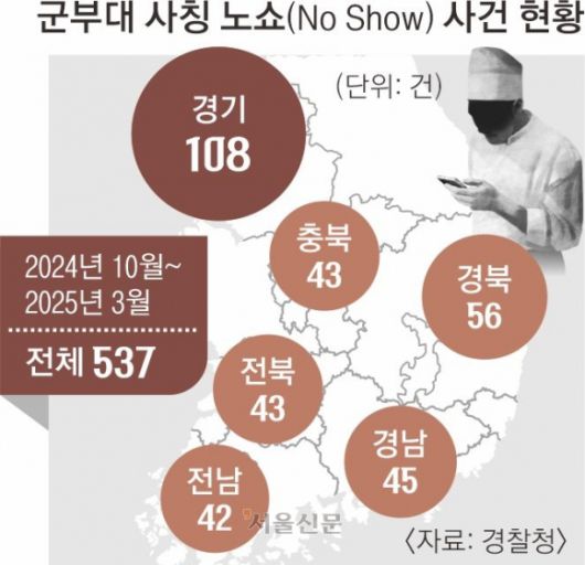 허위 공문서나 신분증 등으로 군 간부를 사칭해 주문을 넣은 뒤 ‘증빙’을 핑계로 돈을 요구하거나 연락을 끊는 사칭·노쇼(No Show) 범죄가 끊이지 않고 있다. 서울신문이 확보한 경찰청 자료를 보면, 지난해 10월부터 올해 3월까지 ‘군 간부 사칭 범죄가 의심된다’며 경찰에 접수된 신고는 모두 537건에 달한다. 경찰청 관계자는 “군 간부 사칭 범죄로 인한 피해는 적게는 1000만원에서 많게는 4억원까지 발생한 것으로 파악된다”고 설명했다.