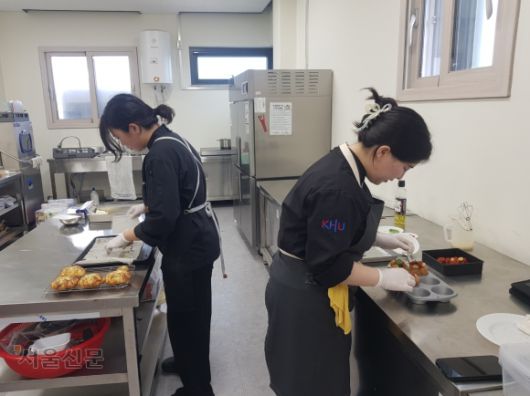 지난 13일 제주 서귀포시 대정읍 대정특화체험센터 작업장에서 경희대 학생들이 대정 특산물인 마늘을 활용한 빵을 만들고 있다. |
