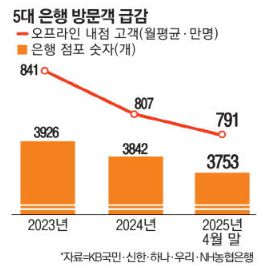 5대 시중은행은 2023년 말 전국 3927개의 점포를 두고 있었지만, 2024년 말엔 165개가 줄어든 3762개를 운영했고, 올해 1분기 말 기준 55개가 추가로 줄어 3707개를 운영중이다. 5대 시중은행은 일단 당분간 추가 점포 폐쇄 계획은 거의 없다고 밝혔다. 농협은행이 1개의 출장소를 7월에 닫는 것 외엔 아직 예정된 것이 없다.
