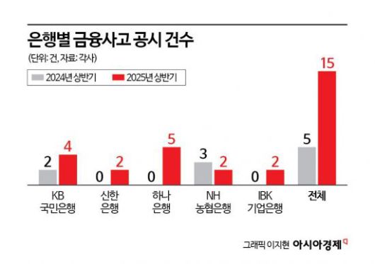 19일 5개 국내 은행(KB국민, 신한, 하나, 농협, 기업은행)이 올해 들어 공시한 금융사고 발생 건수는 총 15건으로 작년 상반기 공시한 5건에 비해 3배나 증가했다. 하나은행이 5건으로 가장 많았으며, KB국민은행 4건, 신한, 기업, 농협 등이 각각 2건씩이었다.