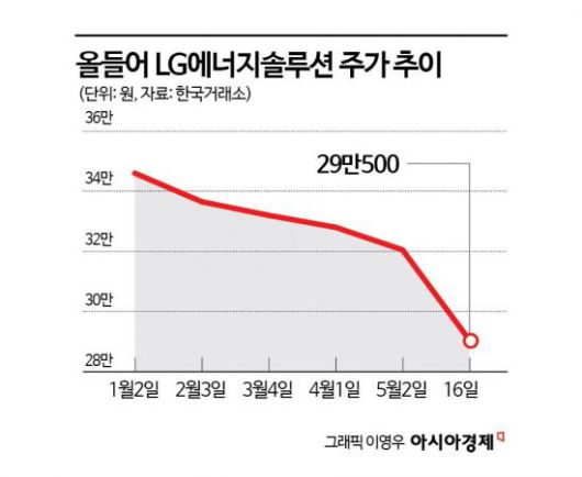 LG에너지솔루션은 이날 5.37% 하락한 29만500원에 마감했다. 장중 29만원까지 하락하며 52주 신저가를 기록했다. 공모가였던 30만원 아래로 떨어진 것은 2022년 1월 상장 이후 처음이다. 시가총액도 70조원 아래로 떨어지면서 시총 3위 자리를 삼성바이오로직스에 내줬다.