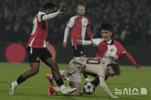 [로테르담=AP/뉴시스] 페예노르트(네덜란드)의 황인범이 6일(현지시각) 네덜란드 로테르담의 스타디온 페예노르트에서 열린 2024-25시즌 유럽축구연맹(UEFA) 챔피언스리그(UCL) 리그 페이즈 4차전 잘츠부르크(오스트리아)와 경기 중 공을 다투고 있다. 황인범은 풀타임을 소화했으나 1명이 후반 퇴장당한 페예노르트는 1-3으로 패했다. 2024.11.07. |
