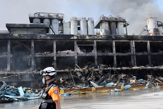 금호타이어 광주공장 화재 발생 이틀째인 18일 소방대원들이 진화 작업을 벌이는 가운데 공장 건물이 검게 타있다. [연합] |