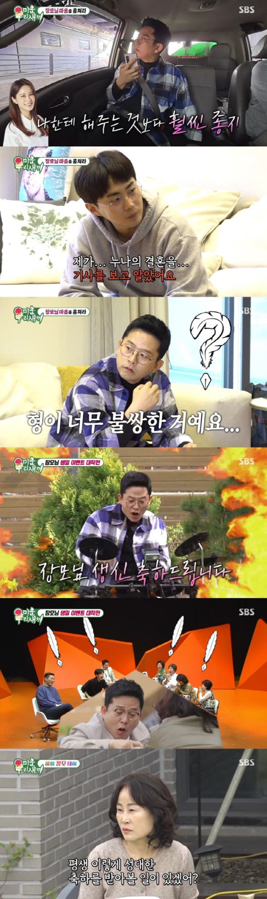 준비한 선물 상자에 들어가 기다린 지 30분째, 드디어 장모님이 도착했고 김준호가 등장할 타이밍이 됐다. 그러나 오랫동안 쭈구려 앉은 탓에 다리 힘이 풀린 김준호가 쓰러지는 진풍경이 펼쳐지며 스튜디오가 웃음바다가 됐다. 김지민의 어머니는 "평생 살면서 이렇게 성대하게 받아볼 수가 있겠나. 진짜 가슴 뭉클하다"라며 감동했다. 스페셜 MC 이상엽은 "지금 열심히 받아 적고 있다. 통돼지 바비큐, 꽃다발, 선물까지 공부 중이다"라고 너스레를 떨어 폭소를 자아냈다.
