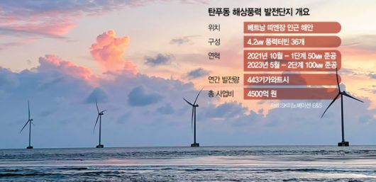 이곳은 SK이노베이션 E&S가 운영 중인 탄푸동(TPD) 해상풍력 발전단지. 축구장 25개가량의 면적에 설치된 4.2㎿급 풍력 터빈 36개가 쉼 없이 날개를 돌리며 전기를 만들어내고 있었다. 높이 105m의 기둥에 지름 150m 날개로 구성된 각 터빈은 500m 간격으로 설치됐다. 띠엔장의 거센 바닷바람을 연료 삼아 파도가 해안가에 부딪히는 것과 같은 풍절음을 내며 돌아갔다.