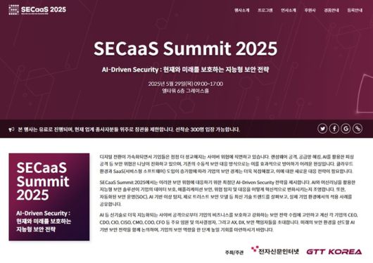 전자신문인터넷과 GTT KOREA는 오는 5월 29일 서울 엘타워 그레이스홀에서 'AI-Driven Security: 현재와 미래를 보호하는 지능형 보안 전략'을 주제로 'SECaaS Summit 2025'를 개최한다. 총 13개 이상의 발표 세션과 기업 부스 전시를 통해 AI 시대에 최적화된 보안 전략과 사례를 공유한다.
