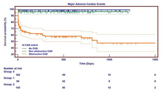 딥러닝 모델의 유효성을 검증하기 위해 전체 환자의 심장 사건 발생을 평균 2년 6개월 간 추적 관찰했다. 환자 중 15%가 심근경색, 불안정 협심증 등으로 입원과 사망을 겪었다. 특히, 폐색성 환자군의 발생률은 38.8%로 정상군(0.6%), 비폐색성군(3.2%)보다 크게 높았다.