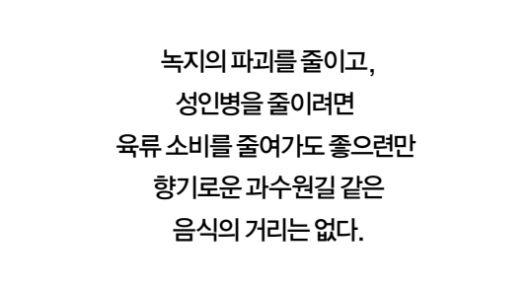 이런 불균형을 해소하고, 소의 방귀로 인한 탄소 배출을 줄이고, 녹지의 파괴를 줄이고, 성인병을 줄이려면 육류 소비를 줄여가도 좋으련만 향기로운 과수원길 같은 음식체의 거리는 없다. 제러미 리프킨의 「육식의 종말」은 이 말로 끝난다. "인간의 음식에서 쇠고기를 없앰으로써 우리는 소는 물론 지구를 공유하는 다른 생명체들과의 유대감을 다지며 새로운 인류 의식을 향한 중요한 발걸음을 내디디게 될 것이다."