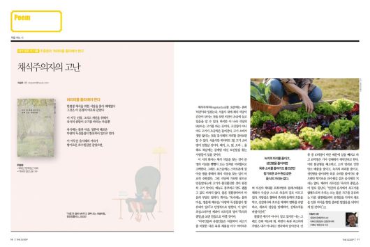 그런 식당에 가보면 콩으로 만들었다는데 고기가 쫄깃쫄깃한 것이 완전히 고기 맛이다. 메뉴도 풍부하고 맛도 괜찮고 값도 비싸지 않다. 물론 친환경이어서 마음의 부담도 덜하다. 화자는 "육식에는 몸과 마음, 영혼에 해로운/ 다량의 독성물질이 함유되어 있다"고 단정적으로 말한다. 이 말이 의심스러우면 제러미 리프킨의 명저 「육식의 종말」을 보면 믿음으로 바뀔 것이다.