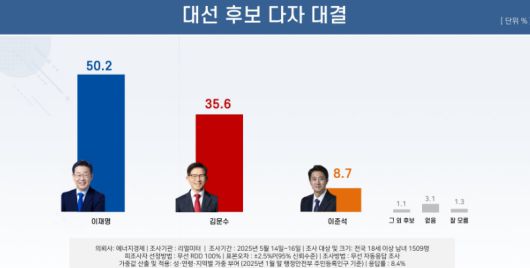 리얼미터가 에너지경제신문 의뢰로 지난 14~16일 전국 18세 이상 유권자 1509명을 대상으로 대선 후보 지지도를 조사(무선(100%) 자동응답 방식, 응답률은 8.4%, 신뢰수준 95%, 표본오차 ±2.5%포인트) 한 결과, 이재명 후보는 50.2%로 오차범위 밖 1위를 기록했다.