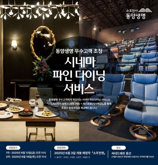 동양생명이 제공하는 시네마 파인 다이닝 서비스는 서울시 용산구에 있는 씨네드쉐프 용산에서 진행되며, 프리미엄 상영관에서의 영화 관람과 고급 레스토랑 식사를 결합한 프로그램이다.