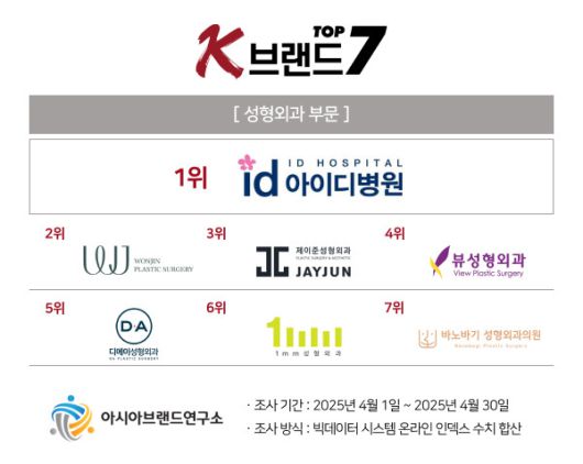이번 ‘K-브랜드 톱7’ 성형외과 부문은 지난 4월1~30일 온라인 빅데이터 1억1197만7074건을 대상으로 조사됐고, 트렌드·소셜·미디어·커뮤니티·긍/부정 인덱스 등의 핵심 빅데이터에 대한 가중치 배제 합산 수치로 산출됐다.