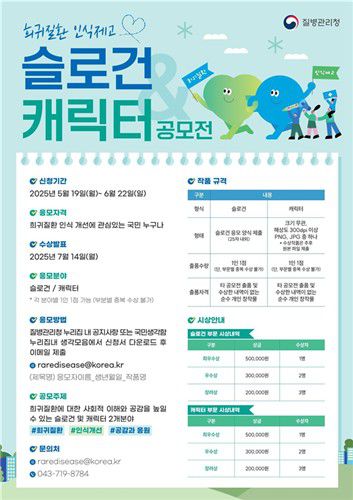 ▲ 질병관리청은 희귀질환에 대한 사회적 관심을 높이고 공감대를 확산하기 위해 6월 22일까지 슬로건·캐릭터 공모를 한다고 19일 밝혔다. 질병청 또는 국민생각함 누리집에서 신청서를 내려받아 25자 내외의 슬로건이나 해상도 300dpi 이상의 캐릭터 이미지 파일을 이메일로 제출하면 되며 분야별로 1개까지만 낼 수 있다. 최종 수상작(부문별 6편)은 대국민 홍보 콘텐츠로 활용되고 수상자에게는 총 340만원의 상금과 질병청장상을 수여한다. (서울=연합뉴스)