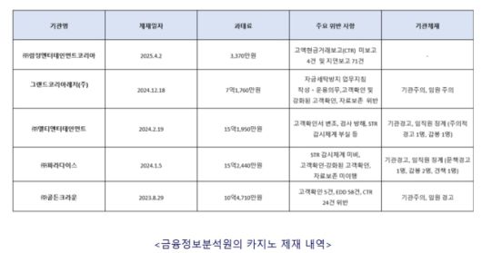 특히 한 카지노 사업자는 검사 직전 약 1만8700건에 이르는 고객확인서를 조직적으로 변조하고 허위자료를 제출한 사실이 적발돼 가장 높은 수준의 제재를 받은 사례로 기록됐다.