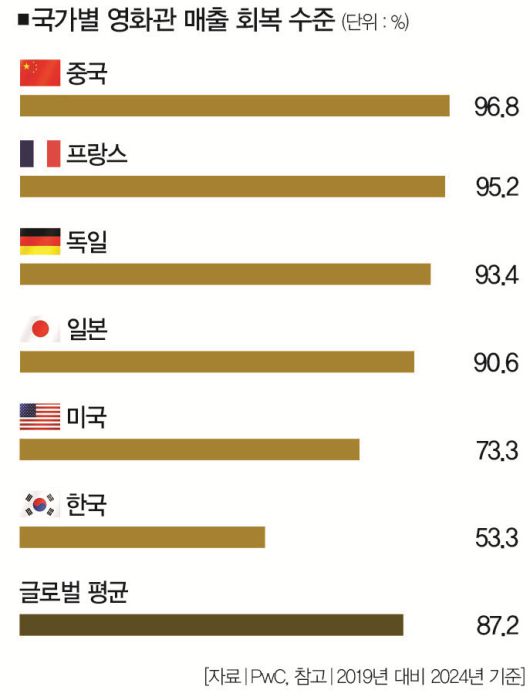 이처럼 영화관 산업을 활성화하기 위해선 풀어야 할 과제가 많다. 영화관들이 넷플릭스 탓만 하고 있어선 안 된다는 거다. 이런 맥락에서 눈여겨봐야 할 통계도 있다. 영국의 회계감사기업 PwC에 따르면 한국의 '영화관 매출 회복률(2019년 대비 2024년)'은 53.3%로 글로벌 평균치(87.2%)를 밑돌았다.