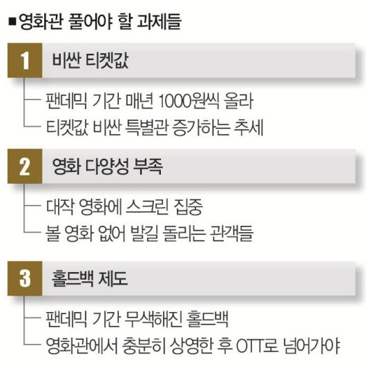 ■ 과제➌ 홀드백 제도 = 영화관들이 직면한 더 큰 문제는 OTT다. 저렴한 가격에 방대한 콘텐츠를 제공하는 OTT와 경쟁하는 건 쉬운 일이 아니다. 이 때문인지 영화 업계에선 '홀드백(Hold Back)' 제도를 강화해야 한다는 주장도 나온다.