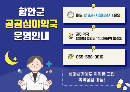 함안군은 군민들이 심야시간대에도 의약품을 편리하게 구입할 수 있도록 칠원읍에 위치한 ‘자이약국’을 공공심야약국으로 지정하고 13일부터 운영한다.