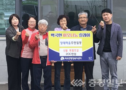 충북 진천군 백곡면 장대마을 이종범 이장 등이 19일 백곡면 행정복지센터에서 이태주 면장(오른쪽)에게 영남지역 산불 피해 주민을 위한 성금 200만원을 기탁했다.