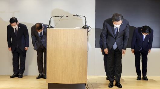 허영인 SPC그룹 회장 등 임직원들이 지난 2022년 10월 21일 오전 서울 서초구 양재동 SPC 본사에서 평택 SPC 계열사 SPL의 제빵공장 사망 사고 관련 대국민 사과를 하고 있다. 연합뉴스 |