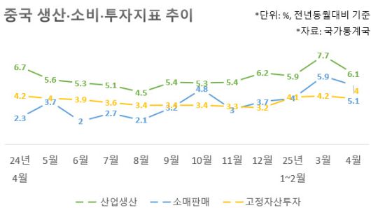 중국의 수출과 생산·소비·투자 등 주요 경제 지표가 증가세는 유지하고 있지만 전월대비 둔화한 모습을 보이고 있고, 4월 제조업 체감 경기 지표인 구매관리자지수(PMI)가 49.0으로 하락 전환하는 등 경계감이 확산되고 있다.