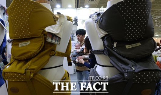 아이를 수월하게 안을 수 있는 보조 기구 아기띠 사용 중에 발생하는 영유아 추락사고 대부분이 머리·얼굴 부상으로이어진 것으로 나타났다. 한 예비아빠가 아기띠를 살펴보고 있다./더팩트DB |