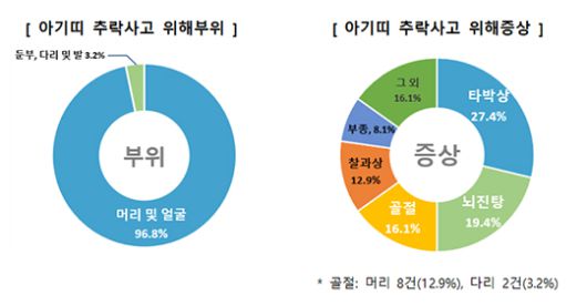 이는 머리가 상대적으로 무거운 영유아의 신체 특성상 추락 시 머리부터 떨어지는 경우가 많았기 때문으로 분석된다.