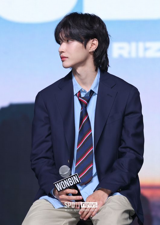 [스포티비뉴스=서울, 곽혜미 기자] 라이즈 첫 정규 앨범 '오디세이(ODYSSEY)' 발매 기념 쇼케이스가 19일 오전 서울 용산구 한남동 블루스퀘어에서 열렸다. 라이즈 원빈이 사회자 이특을 바라보고 있다. <저작권자 ⓒ SPOTV NEWS. 무단전재 및 재배포 금지>