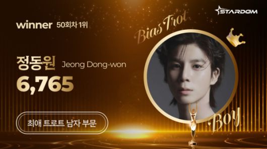 정동원은 5월 셋째주(집계기간 5월 12일~5월 18일) 스타덤 '최애 트롯스타' 남자 부문 주간랭킹 정상을 차지했다.