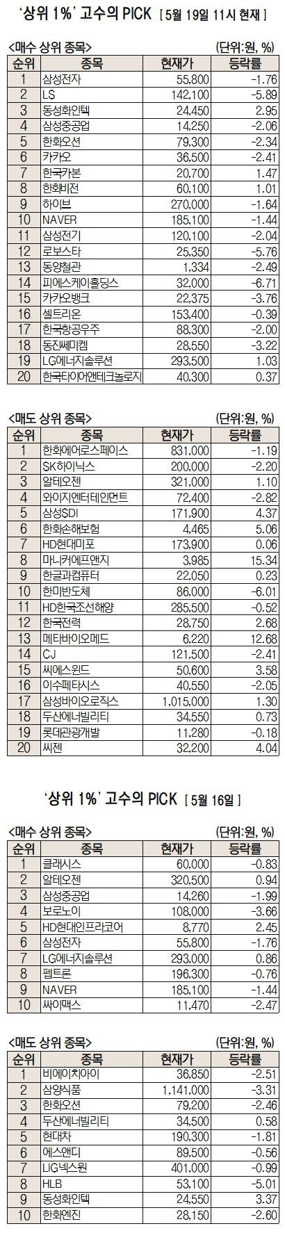 이날 미래에셋증권에 따르면 미래에셋증권 주식 거래 고객 중 최근 1개월간 투자수익률 상위 1%에 해당하는 ‘주식 초고수’들이 오전 11시까지 가장 많이 사들인 종목은 삼성전자다.