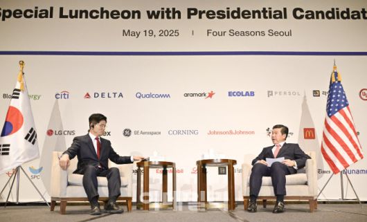 [이데일리 방인권 기자] 김문수 국민의힘 대선후보와 제임스 김 주한미국상공회의소(암참) 회장이 19일 서울 종로구 포시즌스호텔에서 열린 주한미국상공회의소(암참) 간담회에서 대담을 하고 있다.