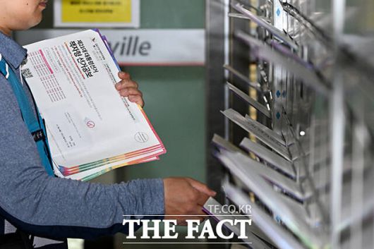 [더팩트ㅣ서예원 기자] 제21대 대통령 선거를 보름 앞둔 19일 오전 서울 강남구 한 오피스텔에서 우정사업본부 집배원이 책자형 선거공보물을 우편함에 투함하고 있다.