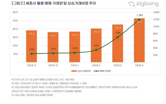 특히 지난달 세종시의 상승 거래 비중은 52.7%로 22개월 만의 최고치였다. 전월(45.3%) 대비 7.4p 오른 것으로, 2023년 6월(53.2%) 이후 가장 높은 수치다.