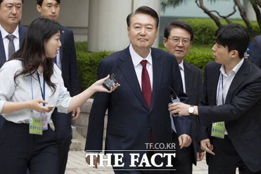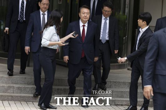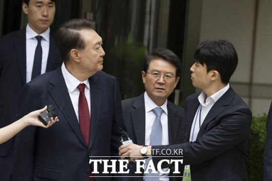 [더팩트ㅣ이새롬 기자] 윤석열 전 대통령이 19일 서울 서초구 서울중앙지방법원에서 열린 내란 우두머리 혐의, 직권남용 권리행사방해 혐의 사건 4차 공판의 오전 재판 종료 후 점심 식사를 위해 법원을 나서며 취재진의 질문을 받고 있다.