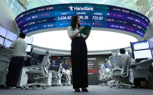 16일 서울 중구 하나은행 딜링룸에 코스피와 원/달러 환율, 코스피 지수가 표시돼 있다./연합 |