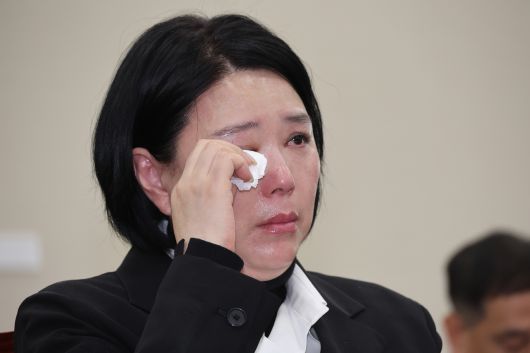 고 오요안나씨의 어머니인 장연미 씨가 국회에 출석해 눈물을 흘리고 있다. [연합] |