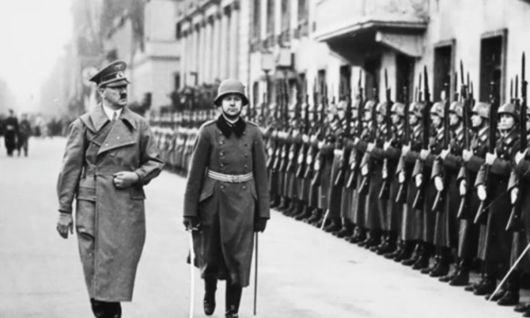 아돌프 히틀러 독일 총통(왼쪽)이 독일군을 사열하고 있다. 히틀러는 의원내각제 국가 독일의 총리로 재직하던 1934년 고령의 대통령이 사망한 뒤 총리와 대통령 직위를 하나로 합치는 법률 개정을 통해 명실상부한 독일의 최고 통치자가 되었다. SNS 캡처 |