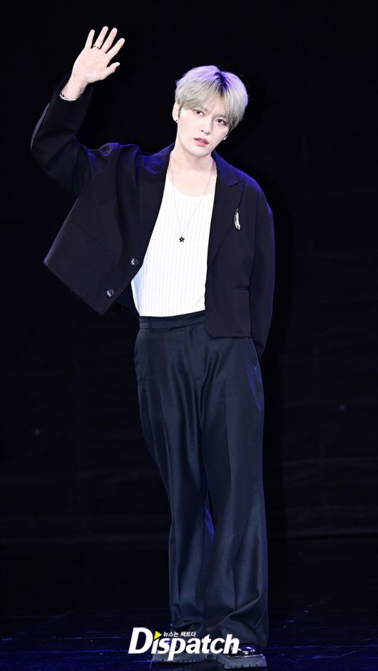 김재중은 화이트 티셔츠와 블랙 재킷, 와이드진으로 깔끔한 스타일링을 연출했다. 조각같은 비주얼과 스윗한 미소도 돋보였다.