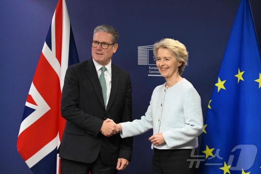 지난해 10월 키어 스타머 영국 총리가 브뤼셀 유럽연합 집행위 본부에서 우르줄라 폰 데어라이엔 집행위원장과 악수하고 있다. 2024.10.02 ⓒ AFP=뉴스1 ⓒ News1 권진영기자