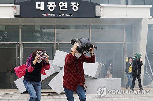 (수원=연합뉴스) 홍기원 기자 = 19일 경기도 수원시 장안구 SK아트리움에서 지진으로 인한 공연장 붕괴 상황을 가정해 열린 '2025년 수원시 재난대응 안전한국훈련'에서 참가자들이 대피하고 있다. 2025.5.19