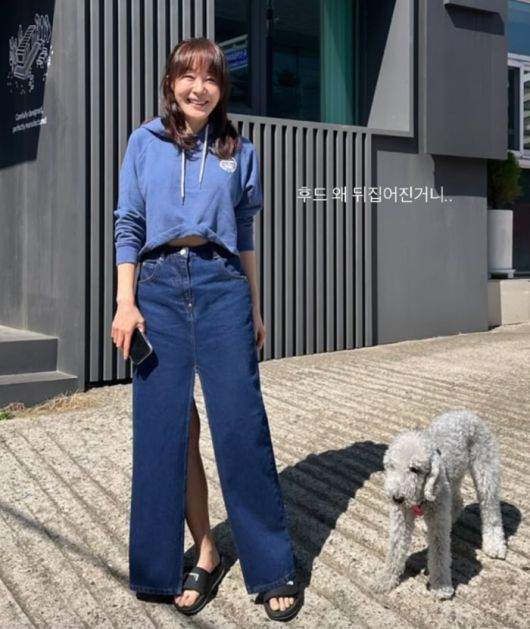 사진 속 엄지원은 반려견과 함께 산책을 나온 모습으로 블루 계열의 후드티와 청바지를 매치해 시원한 컬러감이 돋보이는 코디를 선보였다.