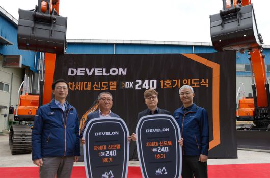 19일 HD현대인프라코어는 인천광역시 동구에 위치한 본사에서 자체 브랜드인 ‘DEVELON’ 차세대 신모델 가운데 하나인 24t급 중형 굴착기(DX240) 1호기 고객 전달식을 진행했다고 밝혔다.