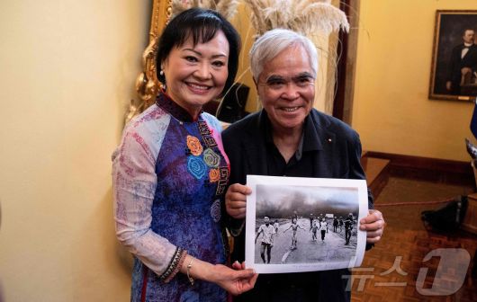 (산호세 AFP=뉴스1) 권영미 기자 = '네이팜탄 소녀'로 알려진 베트남 전쟁 생존자 판 티 킴 푹이 자신의 사진을 찍은 것으로 알려진 닉 웃과 2023년 4월12일 코스타리카 산호세에 있는 외교부에서 함께 사진을 들고 있다. 이 사진기자 닉 웃은 1972년 퓰리처상과 국제보도사진상을 수상했다. 하지만 국제보도사진재단은 2025년 5월 16일 이 사진을 누가 찍은 것인지에 대한 의혹이 제기됐다면서 닉 웃의 이름을 삭제했다고 밝혔다. ⓒ AFP=뉴스1