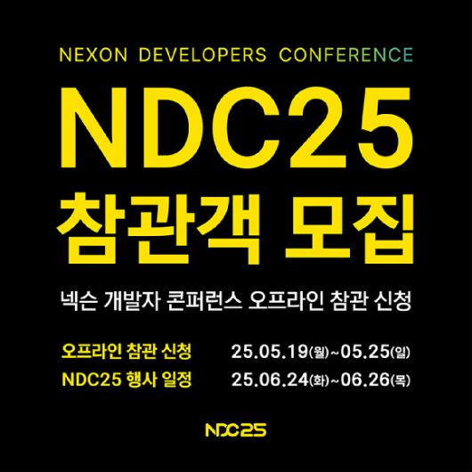 한편 NDC는 2007년 시작돼 올해 18회째를 맞는 국내 대표 게임산업 지식 공유 행사로, 매년 다양한 업계 트렌드와 기술 노하우가 다뤄진다. 올해 넥슨은 글로벌 경쟁 심화에 대응해 산업의 상생과 성장을 위한 소통의 장을 마련하고자 NDC 25를 2019년 이후 6년 만에 공개 오프라인 콘퍼런스로 전환하고, 온라인 생중계도 병행할 예정이다.