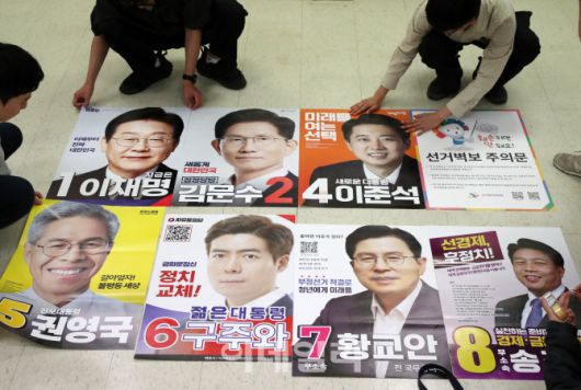 서울시선거관리위원회 관계자들이 14일 서울 중구 남산스퀘어빌딩 회의실에서 제21대 대통령선거 후보자 벽보를 점검하고 있다. (사진=김태형 기자) |