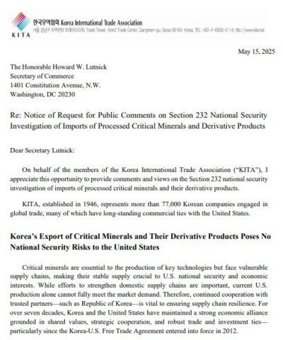 무협은 의견서를 통해 "한국산 가공 핵심광물 및 파생 제품은 미국의 국가 안보를 위협하지 않으므로 232조 조치 대상에서 제외돼야 한다"고 강조했다.