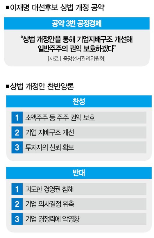 6·3 대선에서 떠오른 논쟁 중 하나는 상법 개정안이다. 이재명 더불어민주당 대선후보가 지난 12일 중앙선관위에 제출한 10대 공약을 통해 상법 개정을 재추진하겠다는 의지를 강조하면서다. "상법 개정안을 통해 기업지배구조를 개선해 일반주주의 권익을 보호하겠다(공약 3번 '공정경제 실현')."
