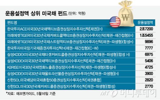 미국채 관련 ETF(상장지수펀드) 중 ACE미국30년국채액티브(H)와 TIGER 미국30년국채커버드콜액티브(H)의 운용설정액은 지난 16일 기준 각각 2조7200억원과 1조5455억원으로 조단위에 이른다.