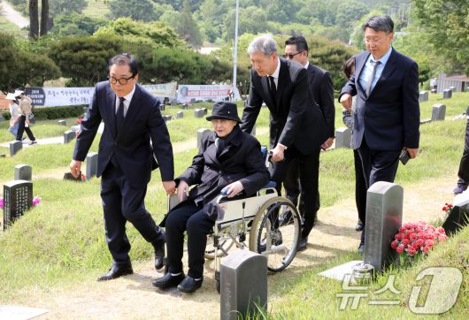 김옥숙 여사는 이날 오후 2시 50분쯤 아들 노재헌 재단법인 동아시아문화센터 이사장과 함께 광주 북구 망월동 민족민주열사묘역(구묘역)을 찾았다.