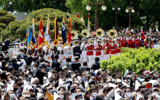 [서울=뉴스핌] 국회사진취재단 = 10일 오전 국회 앞 잔디마당에서 제20대 윤석열 대통령 취임식에서 군악대와 의장대가 행진을 하고 있다. 2022.05.10 photo@newspim.com