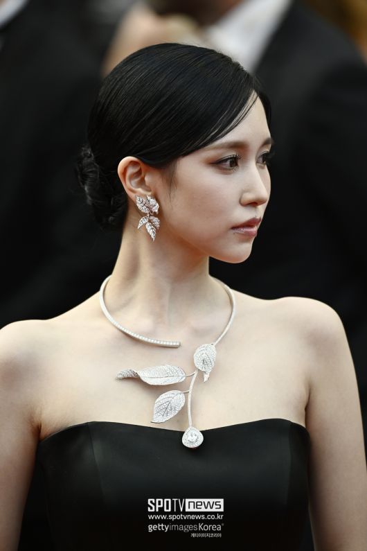 미나는 이날 블랙 튜브톱 드레스를 입고 레드카펫에 올랐다. 깔끔하게 머리를 올려 묶어 얼굴과 목 라인이 잘 드러나게 했고, 나뭇잎을 연상시키는 귀걸이와 목걸이를 착용해 눈길을 사로잡았다.